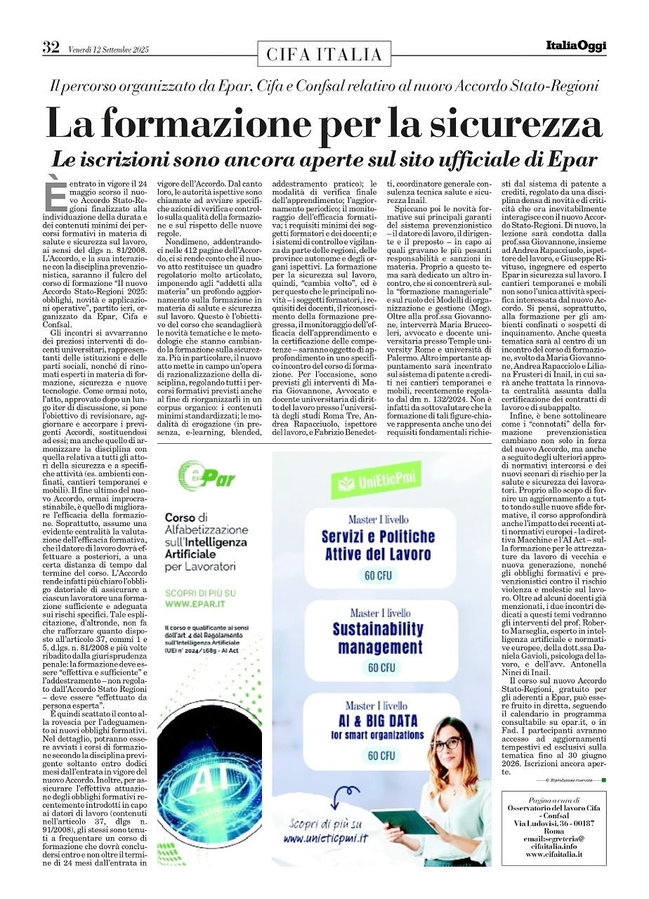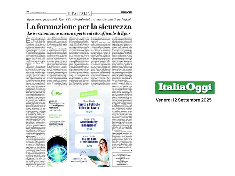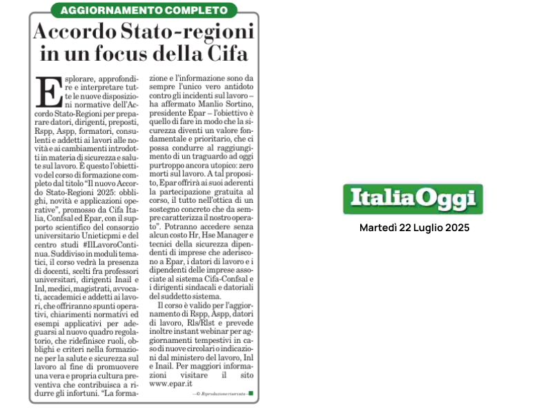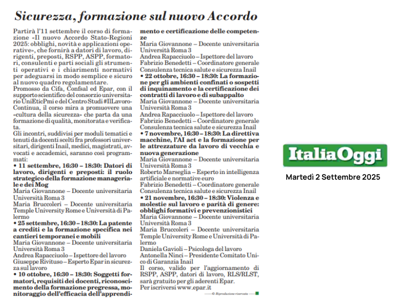 Parte giovedì 11 settembre il corso promosso da Cifa, Confsal ed Epar Il nuovo Accordo Stato-Regioni 2025: obblighi, novità e applicazioni operative, pensato per accompagnare dirigenti, formatori, RSPP, ASPP, datori di lavoro e RLS/RLST nella comprensione e nell’applicazione delle nuove regole sulla formazione in materia di salute e sicurezza sul lavoro.